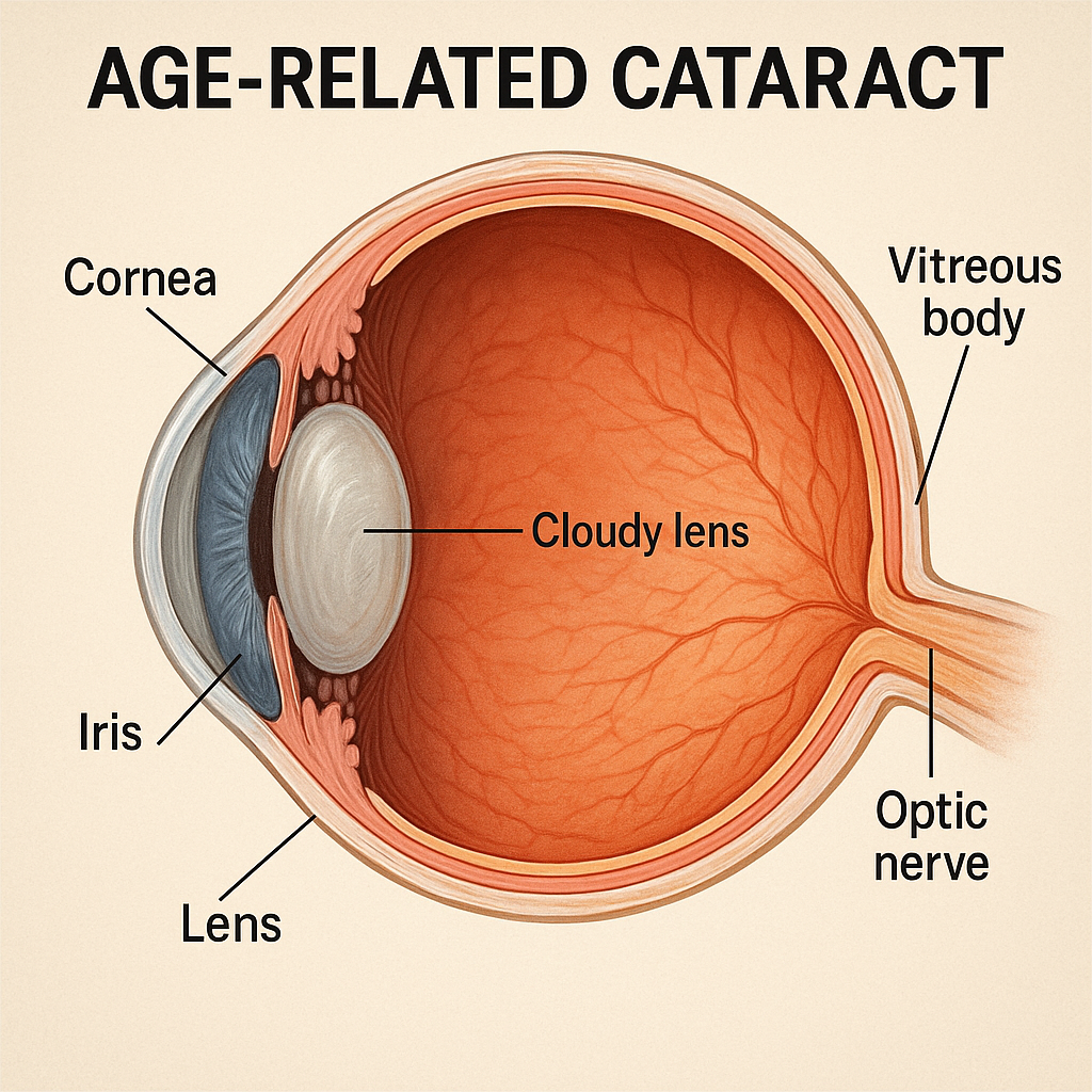 **노인성 백내장(Age-Related Cataract)**은 나이가 들면서 수정체가 혼탁해지는 질환으로, 시야가 뿌옇게 흐려지거나 눈부심, 색감 변화 등이 나타나는 대표적인 노인성 안과 질환입니다. 대부분 60세 이상에서 발생하며, 시력 저하의 가장 흔한 원인 중 하나입니다.