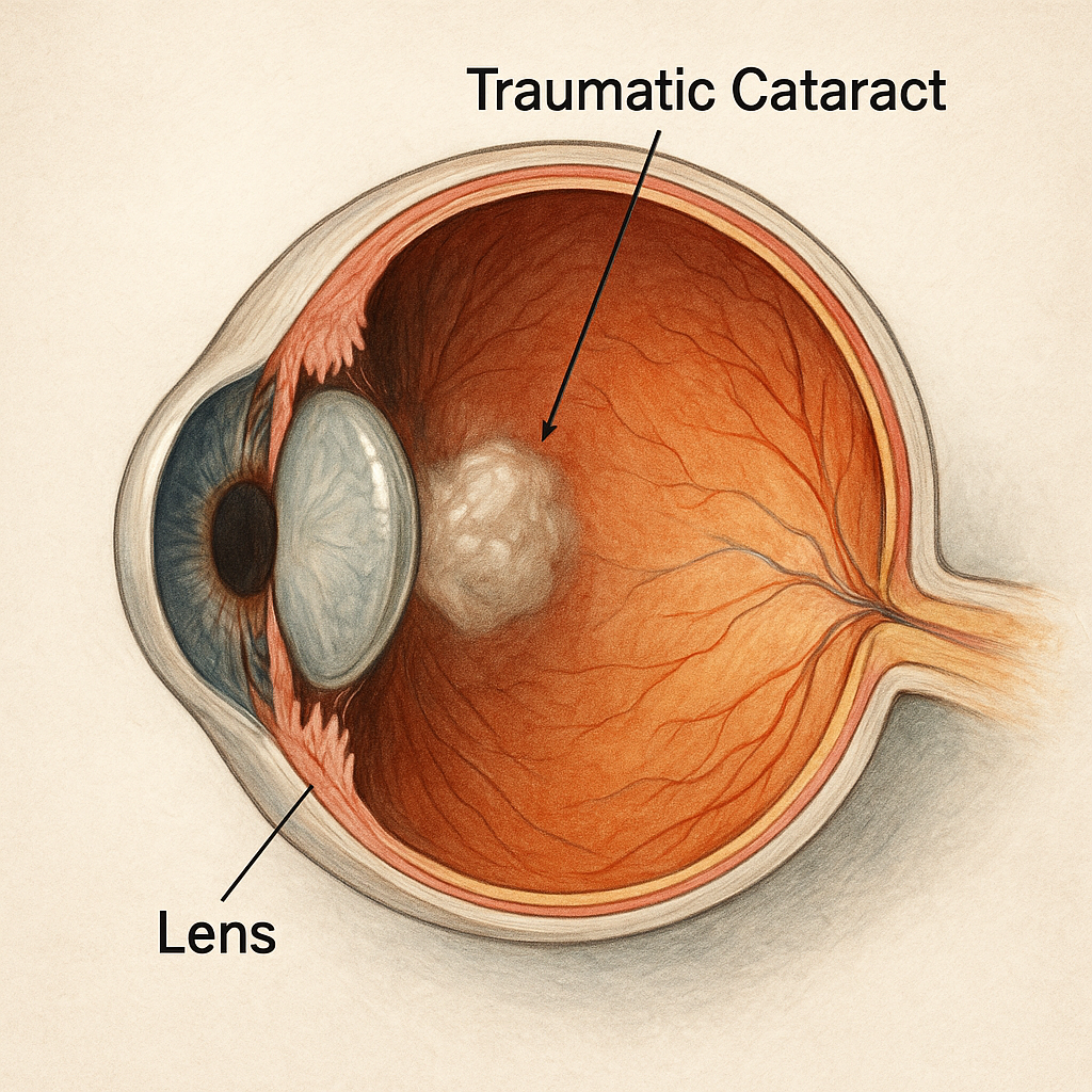 **외상성 백내장(Traumatic Cataract)**은 외부의 물리적 충격이나 화학적 손상으로 인해 발생하는 수정체 혼탁 질환으로, 외상 직후 혹은 수개월~수년 후에도 진행될 수 있습니다. 눈을 찌르거나 맞는 등의 둔상, 관통상, 방사선, 열, 화학물질 등이 원인이 될 수 있으며, 연령에 관계없이 누구에게나 발생할 수 있는 후천적 백내장입니다.