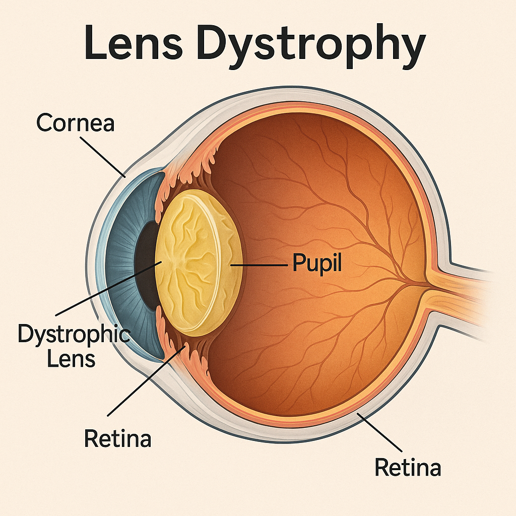 **수정체이영양증(Lens Dystrophy)**은 수정체의 구조적 이상 또는 기능 저하로 인해 수정체가 혼탁하거나 변형되는 유전성 질환입니다. 주로 유전적 소인으로 발생하며, 수정체가 점진적으로 변성되어 시력 저하를 초래할 수 있습니다.