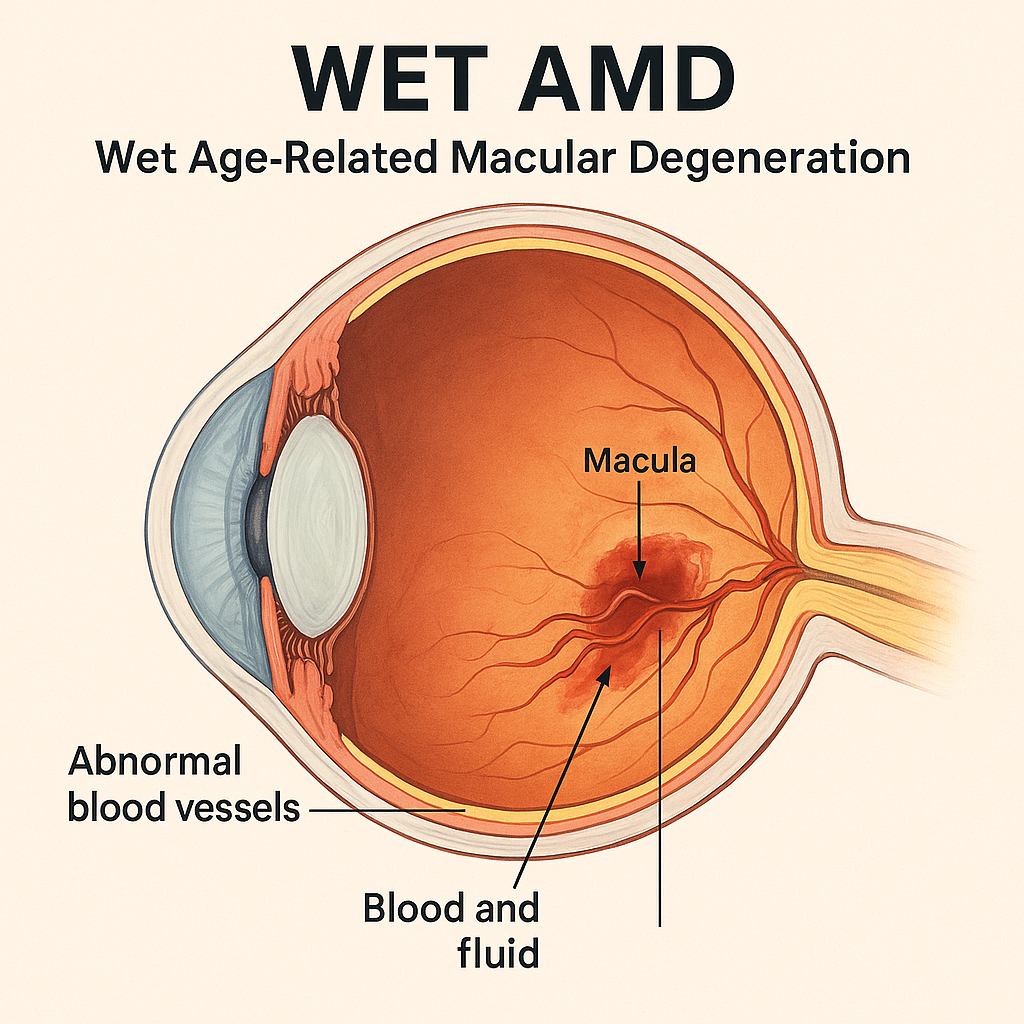 **습성 황반변성(Wet AMD)**은 망막의 중심부(황반)에 신생혈관이 비정상적으로 자라면서 출혈과 부종을 유발하는 질환으로, 급격한 시력 손실을 초래할 수 있는 퇴행성 망막 질환입니다. 노인성 황반변성 중 약 10~15%를 차지하지만, 전체 시력 손실 원인의 주요 요인 중 하나입니다.