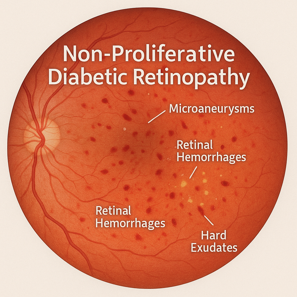 **비증식성 당뇨망막병증(NPDR)**은 당뇨병으로 인해 망막의 미세 혈관이 손상되고 출혈, 미세동맥류, 삼출물이 발생하는 초기 당뇨망막병증입니다. 신생혈관이 생기지 않으며, 초기에는 증상이 경미할 수 있지만 진행 시 시력 저하로 이어질 수 있습니다.