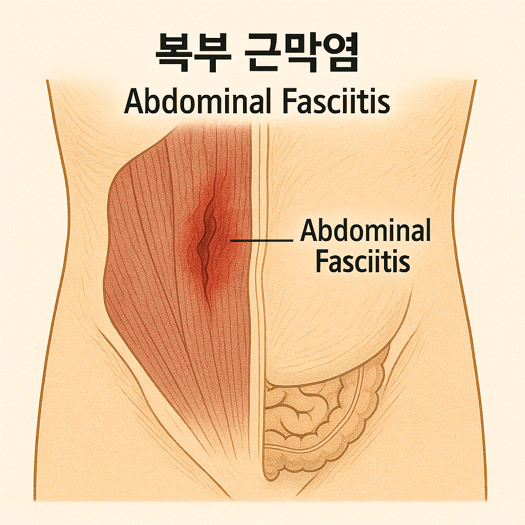 **복부 근막염(Abdominal Fasciitis)**은 복부 근육을 둘러싼 근막에 염증이 발생하는 상태로, 감염, 외상, 과도한 스트레스 등으로 발생할 수 있습니다.