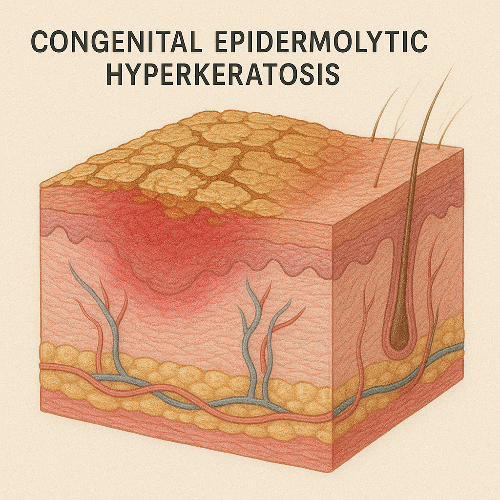 선천성 표피이형성증(Congenital Epidermolytic Hyperkeratosis, EHK)은 출생 시부터 피부가 물집이나 벗겨짐을 보이는 드문 유전성 피부질환입니다. 표피 세포 간 결합 단백질의 결함으로 인해 피부 장벽이 약해지며, 표피의 각질 형성 이상과 함께 심한 각질화(hyperkeratosis)가 진행됩니다. 이는 ‘유전성 수포성 각화증’으로도 불리며, 일생을 통해 지속적으로 증상이 나타납니다.