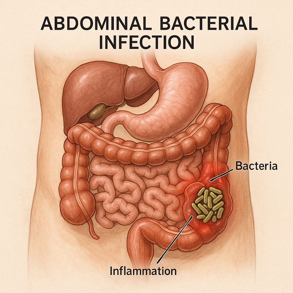 복부 세균 감염은 복강 내 장기 또는 공간에서 세균이 증식하여 염증, 고름, 괴사 등을 유발하는 상태를 의미합니다. 복막염, 장관 감염, 농양 형성 등 다양한 형태로 나타나며, 빠른 치료가 없을 경우 패혈증으로 진행할 수 있어 치명적일 수 있습니다.