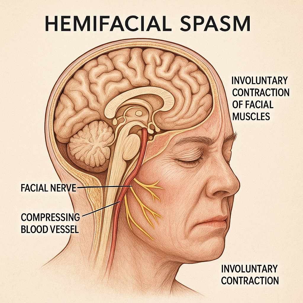 안면경련증(Hemifacial Spasm)은 한쪽 얼굴 근육이 본인의 의지와 무관하게 반복적으로 수축하는 질환으로, 대부분 **안면신경(제7뇌신경, Facial Nerve)**이 혈관에 의해 압박을 받으면서 발생합니다. 초기에는 눈 주위에서 시작되어 점차 입, 볼, 목 근육까지 확대되며, 기능적 장애와 심리적 위축을 유발할 수 있습니다.