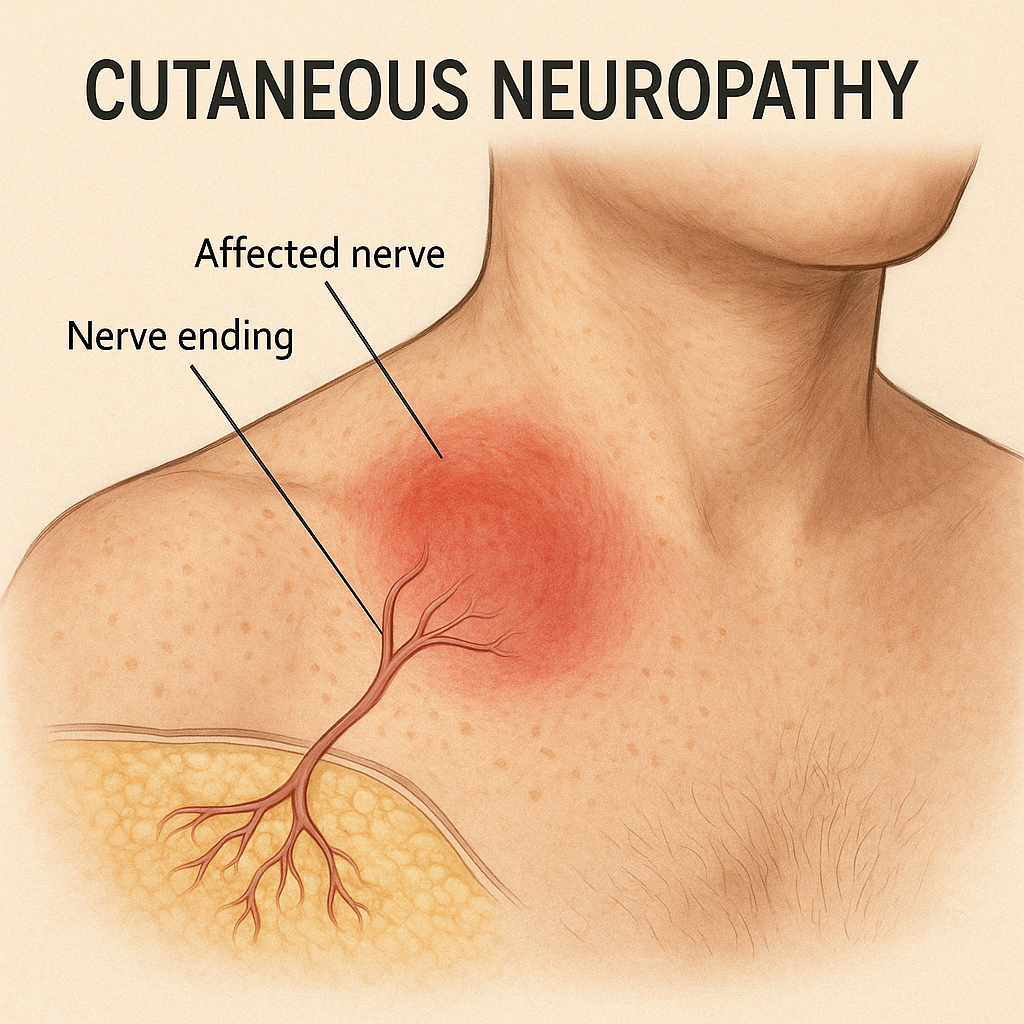 피부 신경병증(Cutaneous Neuropathy)은 피부에 분포한 말초신경의 손상 또는 기능 이상으로 인해 통증, 감각 저하, 이상감각 등이 나타나는 상태를 의미합니다. 말초 신경병증의 한 형태로, 국소적인 피부 부위에서 이상 감각이 지속되며 다양한 전신 질환과 관련되어 나타날 수 있습니다.