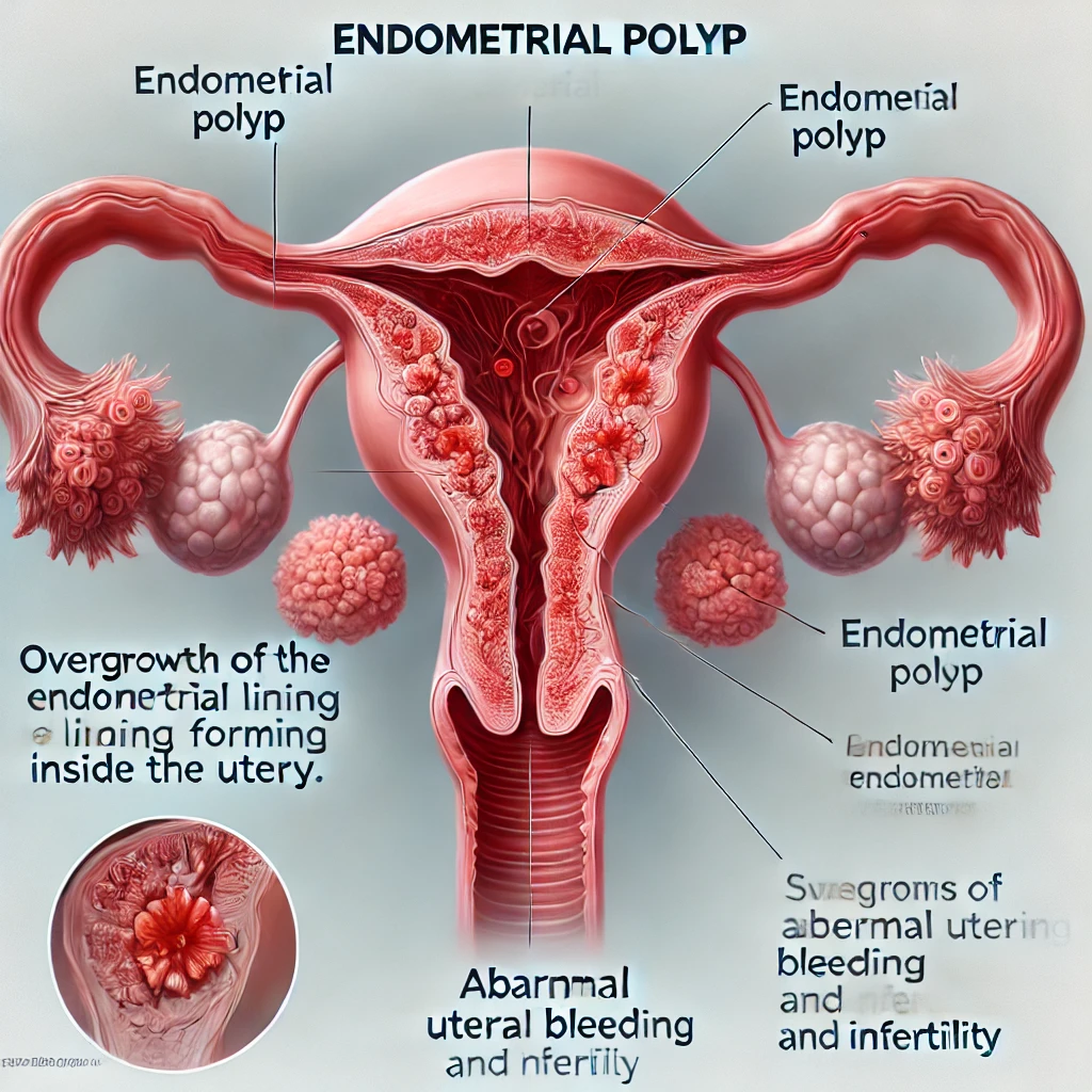 자궁내막폴립(Endometrial Polyp)은 자궁 내막에 비정상적인 조직이 증식하여 형성되는 작은 혹(폴립)입니다. 크기는 수 밀리미터에서 몇 센티미터까지 다양하며, 단일 또는 다발성으로 발생할 수 있습니다. 대부분 양성이지만, 드물게 자궁내막암과 관련될 수 있어 정기적인 관리가 필요합니다.