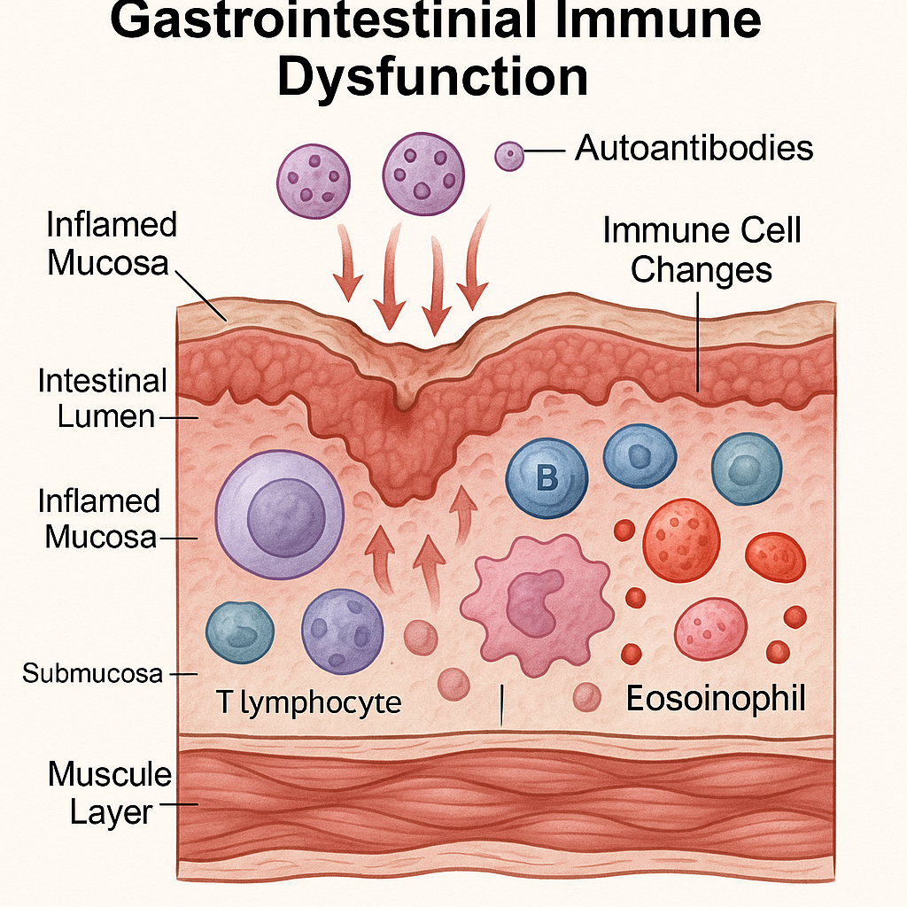 위장관 면역 이상은 소화관 내 면역계가 비정상적으로 반응하거나 기능이 저하되어 염증, 감염, 자가면역반응, 과민증 등이 발생하는 상태를 말합니다.