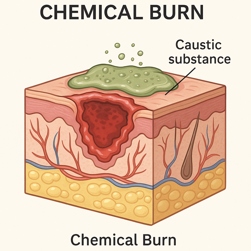 **화학적 화상(Chemical Burn)**은 피부나 점막이 산(acid), 염기(base), 용매(solvent) 등 화학물질에 노출되었을 때 발생하는 조직 손상입니다. 단순한 열 화상과는 달리, 노출 시간이 길어질수록 깊고 넓게 손상되며, 일부는 전신 독성이나 흡입 손상으로 이어질 수 있어 응급 처치와 신속한 전문 치료가 필요합니다.