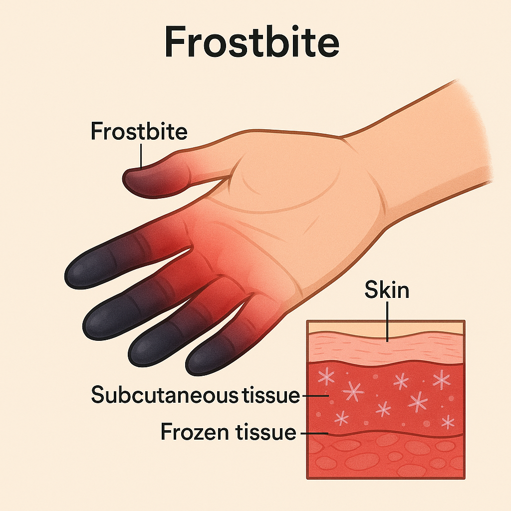 **동상(Frostbite)**은 피부와 그 아래 조직이 영하의 온도에 장시간 노출되어 조직이 얼고 손상되는 상태를 말합니다. 주로 손, 발, 귀, 코 등 혈액 순환이 약한 말단 부위에서 발생하며, 조직 괴사 및 절단까지 이어질 수 있는 응급 상태입니다. 빠른 온난화 치료와 손상 깊이에 따른 적절한 조치가 필수입니다.